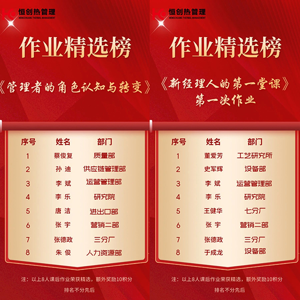 課程結(jié)束后,不少學(xué)員表示經(jīng)過本次課程學(xué)習(xí)后深有啟發(fā),意識到了自己不知不覺中已處在角色的誤區(qū)中,后續(xù)要努力進行角色認知轉(zhuǎn)變,才能更好的帶領(lǐng)團隊取得優(yōu)異成果。此外,向各位學(xué)員提出并布置了課后實戰(zhàn)要求以及《新經(jīng)理人的第一堂課》的在線課程學(xué)習(xí)。截止6月底,《管理者角色認知與轉(zhuǎn)變》作業(yè)提交33份,評選優(yōu)秀作業(yè)8份;《新經(jīng)理人的第一堂課》作業(yè)提交30份,評選優(yōu)秀作業(yè)8份。學(xué)員們在實戰(zhàn)中,用知識解決問題,達到學(xué)以致用的目的。